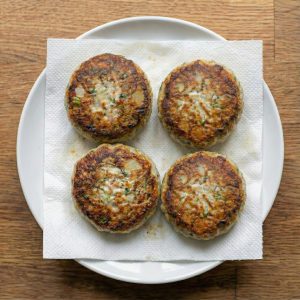 - Remove the cooked cakes to a plate lined with paper towels to drain any excess oil. Fry any remaining mixture in batches.