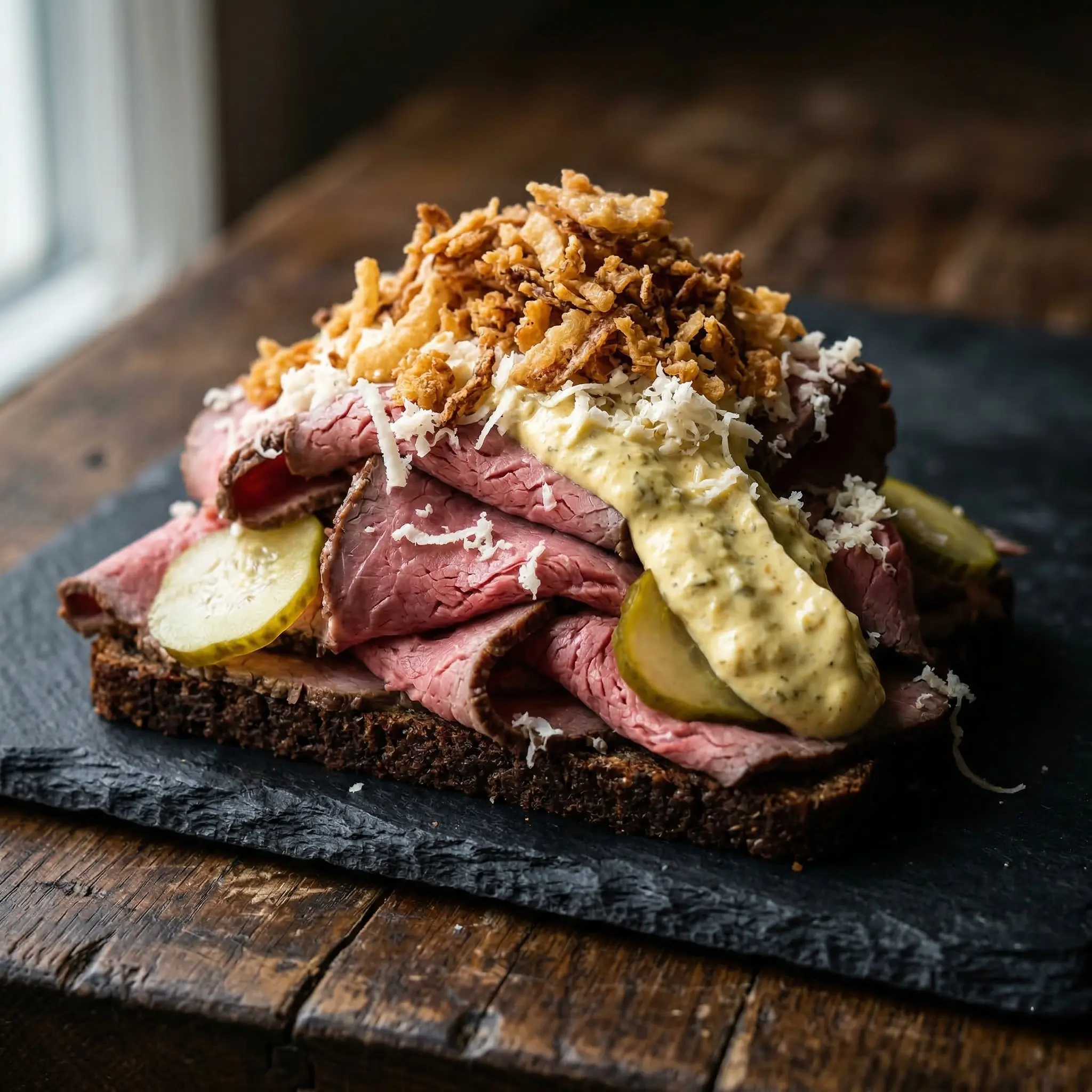 This is the heavyweight. The one that makes you put down your phone, pick up your knife and fork, and commit fully to the experience. It follows the classic Danish roast beef smørrebrød (roastbeef smørrebrød) that has anchored Danish lunch counters for over a century — and the cardinal rule applies here more than anywhere else: this is a mountain of roast beef situation. Restraint is not invited. The result hits every note at once — tender beef, tangy pickles, creamy remoulade, sharp horseradish, and shatteringly crispy onions. It is, without apology, a small act of genius.