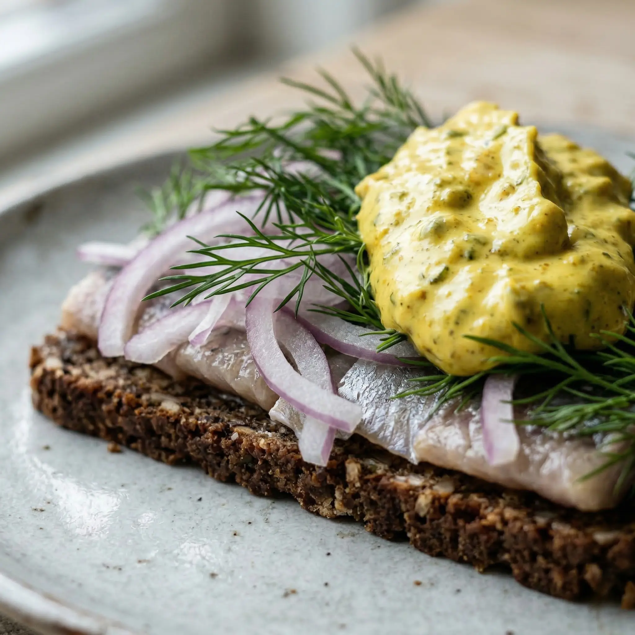 This is smørrebrød at its most honest and most Danish. Briny fish, sharp raw onion, a cloud of fresh dill, and a generous off-center spoonful of curry remoulade — it’s the combination that has been anchoring lunch counters in Copenhagen for generations, and it earns every bit of that tenure. Simple to assemble, impossible to improve upon.